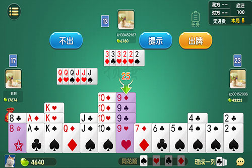 4)接风:如果说场上某一名玩家的最后一手牌出手之后,剩余的玩家全都接不住,那么下一轮游戏的出牌权就会交由他的对家,也就是他的队友玩家。