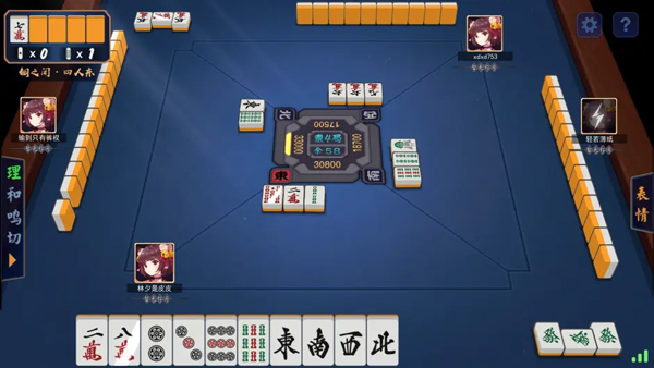 3、对战画面清晰直观,牌面设计采用日本麻将传统字体风格。点击要打出的牌即可切牌,遇到可以“吃”“碰”“杠”的情况时,点击对应提示完成操作。需要注意的是,遵循立直麻将的规则,必须有“役”才能胡牌,规则统一又充满挑战性。