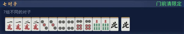 然后是对对胡和七对子,当咱们手牌对子比较多的时候就可以考虑打这两种。一般来说两轮下来能有四个对子就可以尝试去凑。