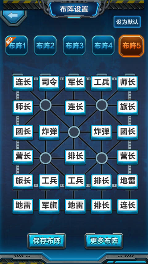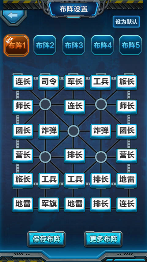 棋子在自己的阵营里阻击对手的进攻为防守,针对对手进攻自己而布的阵是防守型布局,重兵多陈于旗侧,其关键在于周密。在自己有足够的防守实力的情况下,防守型布局在局部防守战斗中不吃亏,这是防守型布局的特点。一般的防守型布局在军旗一侧能够经得起对手两个司令的进攻,大多拥有两炸或一炸一令的实力。