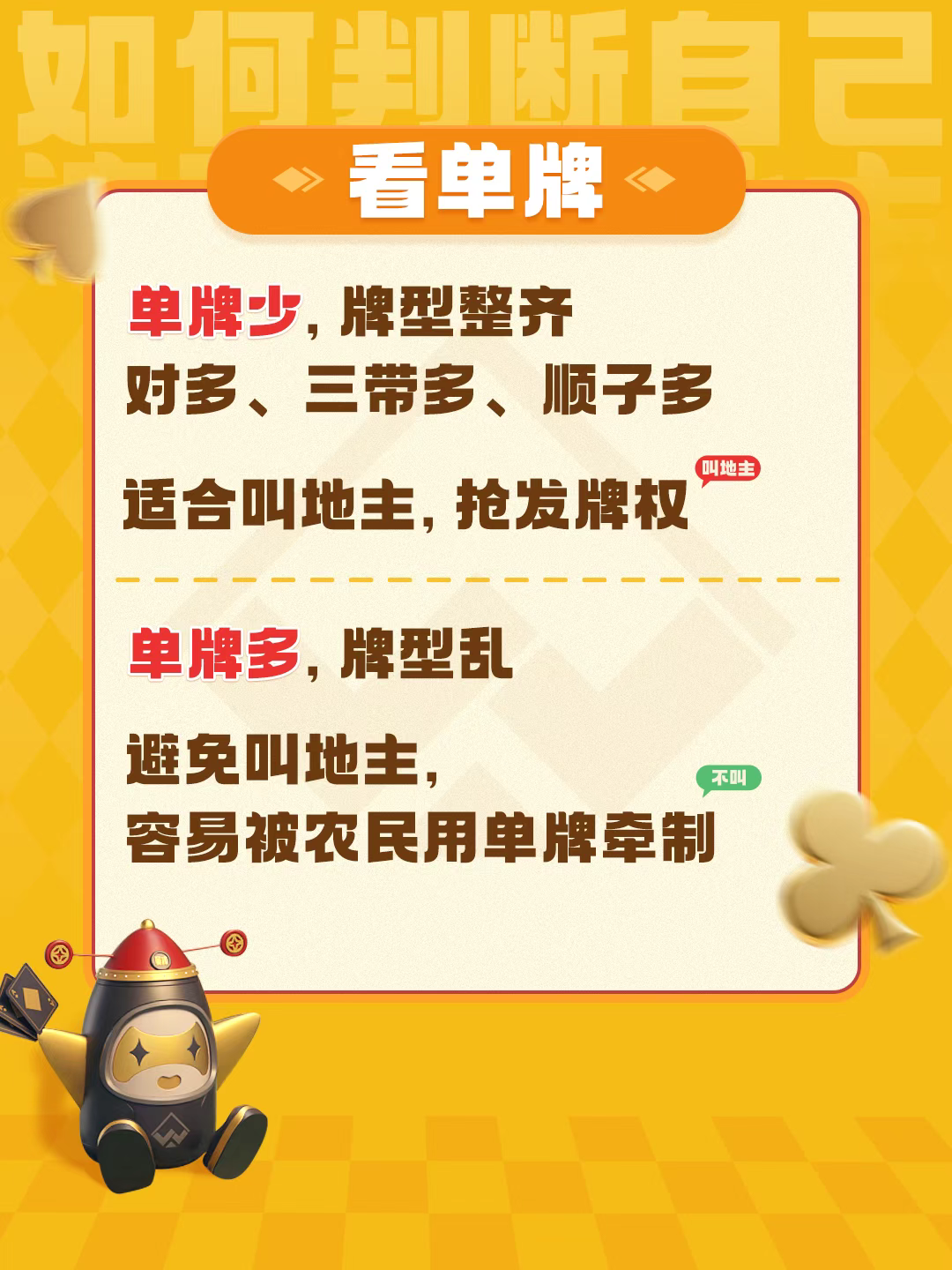 单牌少,牌型整齐,对多、三带多、顺子多,可以叫地主;单牌多,避免叫地主,容易被农民用单牌牵制。