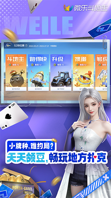 微乐斗地主是一款经典斗地主手游,游戏玩法涵盖主流斗地主规则和丰富的地区特色,刨幺、掼蛋、够级、挖坑等应有尽有,更有独创玩法如至尊八喜牌、癞子+喜牌等,带来惊喜翻倍的刺激对局,趣味无穷。微乐斗地主手机版还支持真人在线匹配,海量用户在线一秒组局,快速开局无需等待。与同城牌友切磋交流,感受方言语音互动的独特魅力,增添游戏的趣味性。好友之间还能定制约局,闲暇时光来一局轻松打发时间!