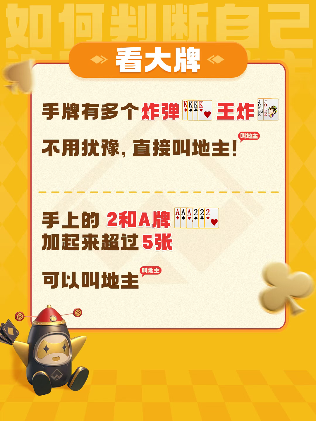 手牌有多个炸弹、王炸,不用犹豫,直接叫地主!手上的2和A牌加起来超过5张,也可以考虑叫地主。