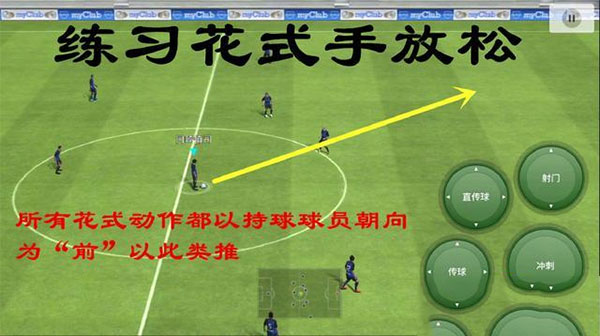下面是入门花式介绍,所有花式动作的按法都以球员朝向为基准做微调,这点要注意。