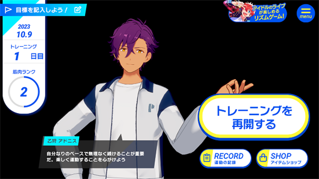 偶像梦幻祭Training是一款体育竞技类手游。延续了人气游戏《偶像梦幻祭》的角色和音乐魅力,但创新地将健身元素与偶像养成玩法相结合,玩家可以选择自己喜爱的偶像角色作为专属健身教练,通过游戏内的运动感应功能,将现实中的运动动作映射到游戏中,你可以在训练过程中搭配《偶像梦幻祭》中的热门曲目,跟随节奏完成动作挑战,不仅锻炼身体,还能沉浸在偶像世界的氛围中。偶像梦幻祭Training日服游戏中还提供了详细的训练数据记录功能,包括累计训练日数、肌肉等级和每日训练反馈等。玩家可以清晰看到自己的进步轨迹,根据数据制定更科学的训练计划。