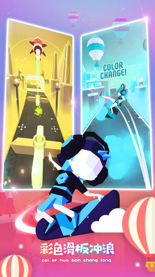 《滑板色彩冲浪》是一款跑酷手游,游戏采用彩绘画风,玩家将踏着滑板在各种造型奇特的赛道中滑行。赛道中所布置的五颜六色的立体,将是是你最大的障碍。人物造型非常酷炫,当他们滑行时还能勾勒出美丽的弧线,为玩家带来强烈的视觉冲击。