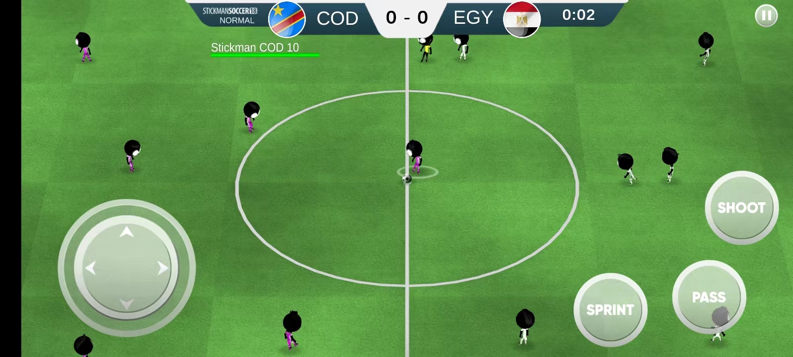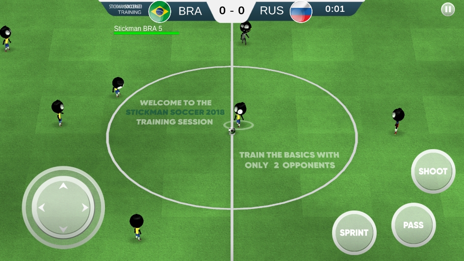 2、之后会进入培训,左方虚拟按键控制角色移动方向,右方虚拟按键分别为传球、射门、进攻,玩家需要控制火柴人带球过人,将球射入对方足球框中即为得分;