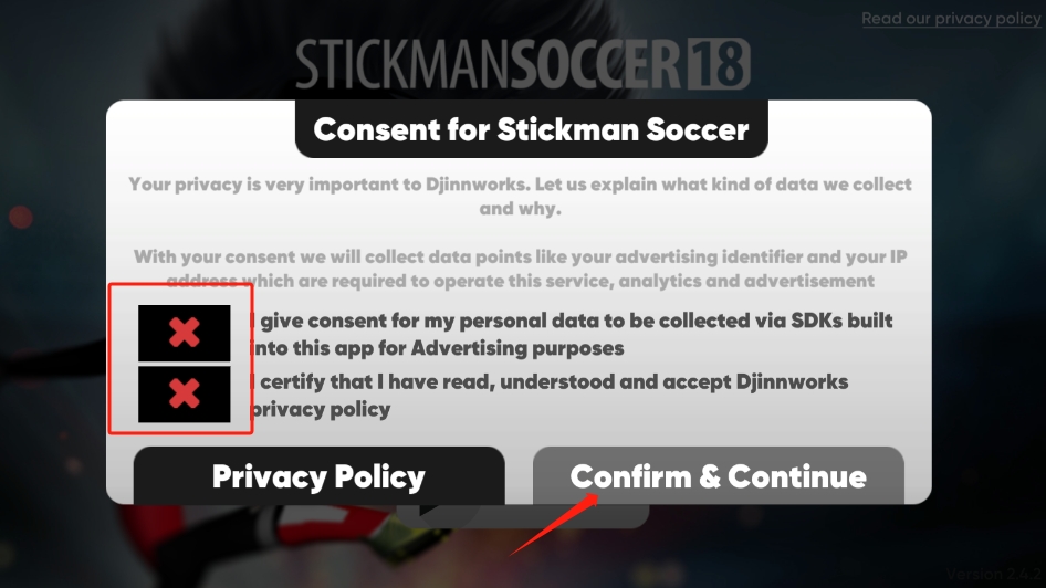 1、首先,玩家在本站下载并安装好游戏之后,打开进入,先点击下图这两处地方,然后再点击【confirm&continue】;