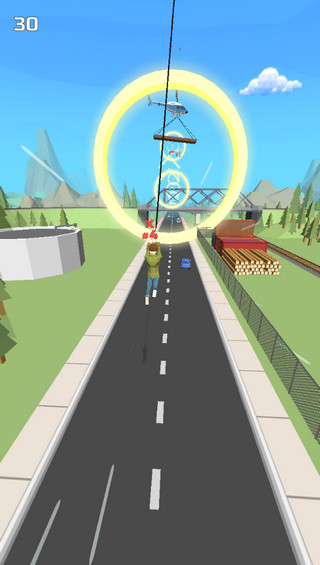 像蜘蛛侠那样在城市中摆荡飞行吧!这款马路飞人游戏就是这样玩儿的!玩家将在游戏中与来自世界各地的人们一起竞争第一名!每局比赛将进行四次飞行,最后一名选手将淘汰出局!只有在四次飞行比拼中保持不落后,并且争夺最快速度到达终点才能获得比赛冠军!长按屏幕发射绳索,然后开始摆荡飞行吧!但切记不要飞得太高而错过空中的加速圈!注意在合适的时机松开绳索,让角色滑翔或者下落,穿过加速圈才能飞得更快,为你抢得先机~而且这些加速圈是一次性的,有人穿过后便会消失,利用这一点让对手无圈可穿,他们的速度将大大落后,再也追不上你!